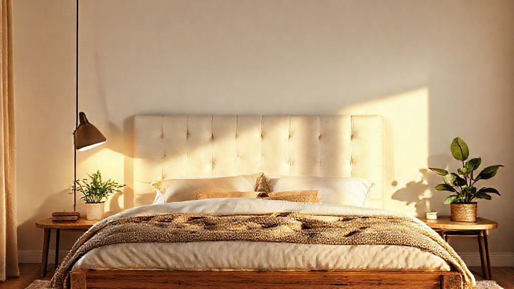 [FEATURED_IMAGE: photorealistic, 8k: A sunlit modern bedroom scene featuring a plush bed with layered textiles, a warm neutral palette, a statement headboard, n…