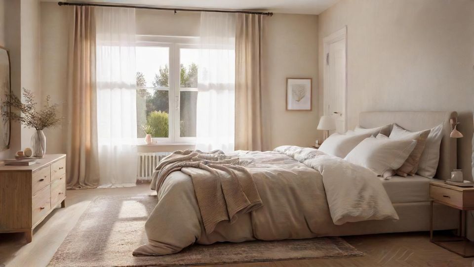 [FEATURED_IMAGE: photorealistic, 8k, detailed description: a sunlit modern bedroom with a calm color palette, soft gray walls, a plush white duvet on a king-siz…